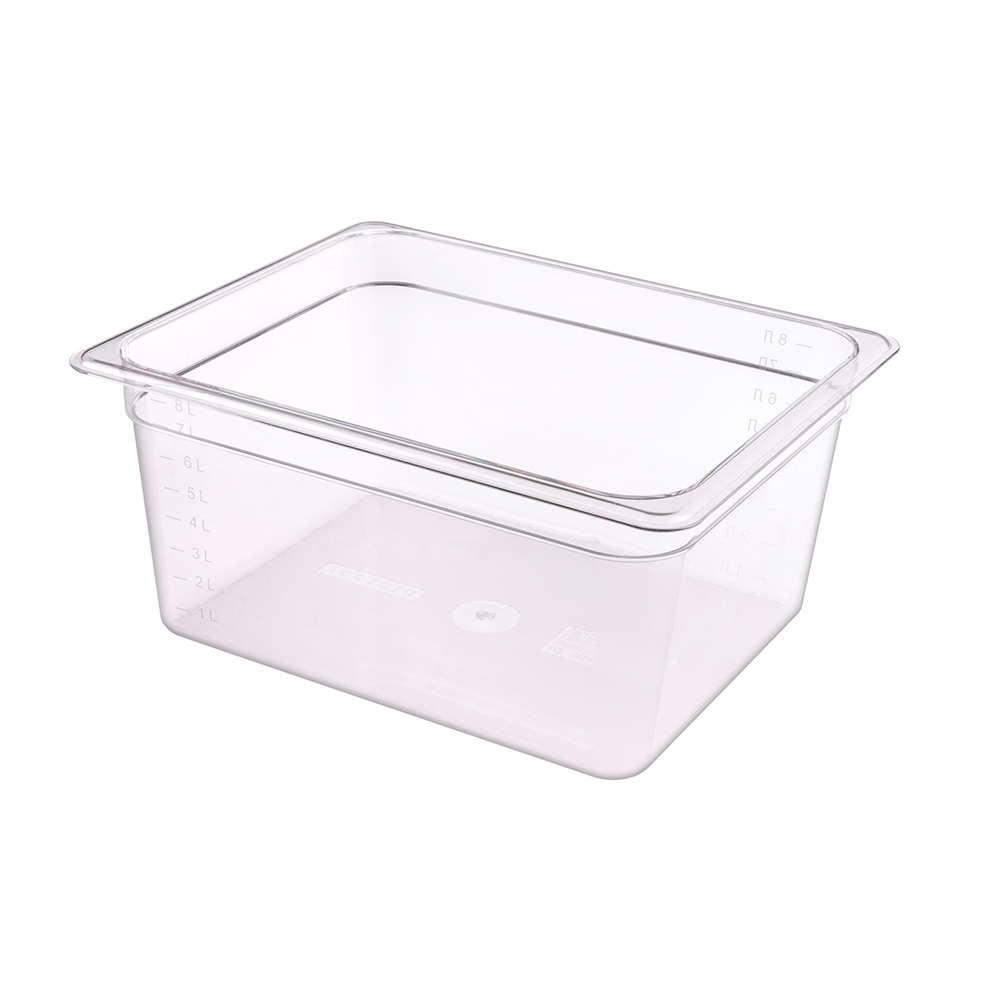 Гастроемкость GN 1/2 глубиной 150 мм, торговая марка RESTOLA. Изделие может использоваться на предприятиях общественного питания для хранения, замораживания и разогревания пищи, а также в кейтеринговых компаниях для транспортировки готовой еды. Предназначена для использования в температурном диапазоне от -40°С до +100°С. Гастроемкости можно мыть в посудомоечной машине при температуре до +95°С, используя любое моющее средство. Изготовлена из поликарбоната, цвет прозрачный, углы и дно корпуса имеют шершавую структуру, что повышает износостойкость при эксплуатации. Есть мерная шкала. Размеры производимых гастроемкостей являются унифицированными в соответствии со стандартом Gastronorm и позволяют использовать их совместно с современным кухонным оборудованием и инвентарем.
