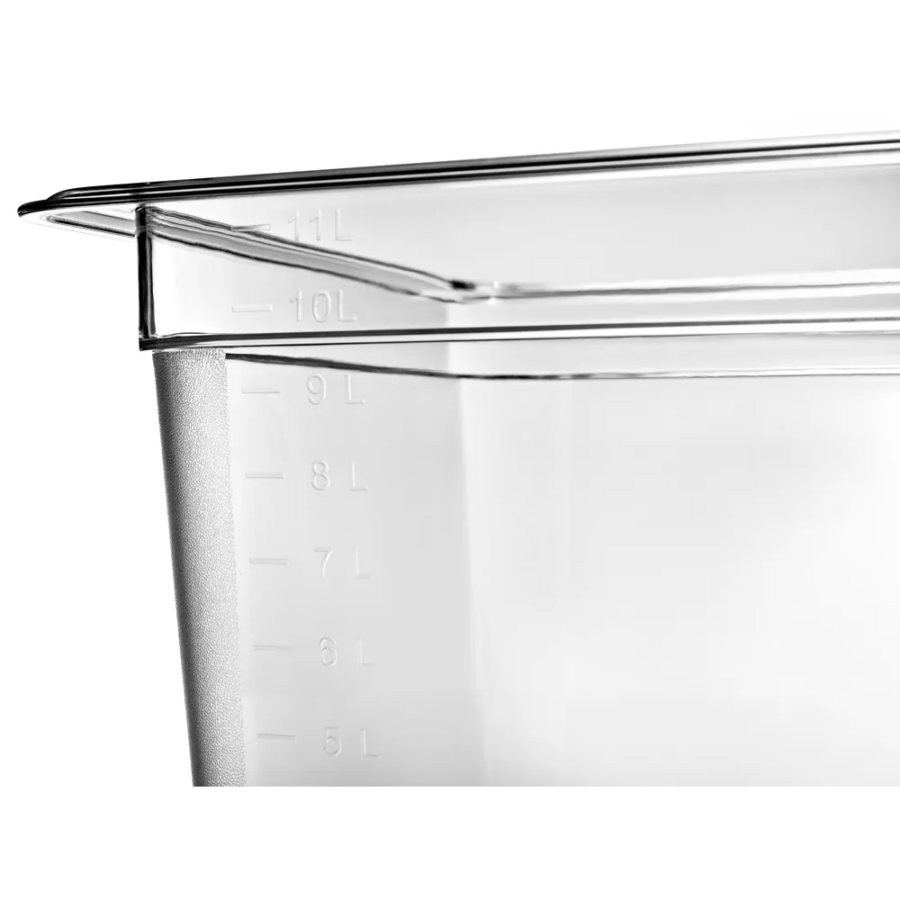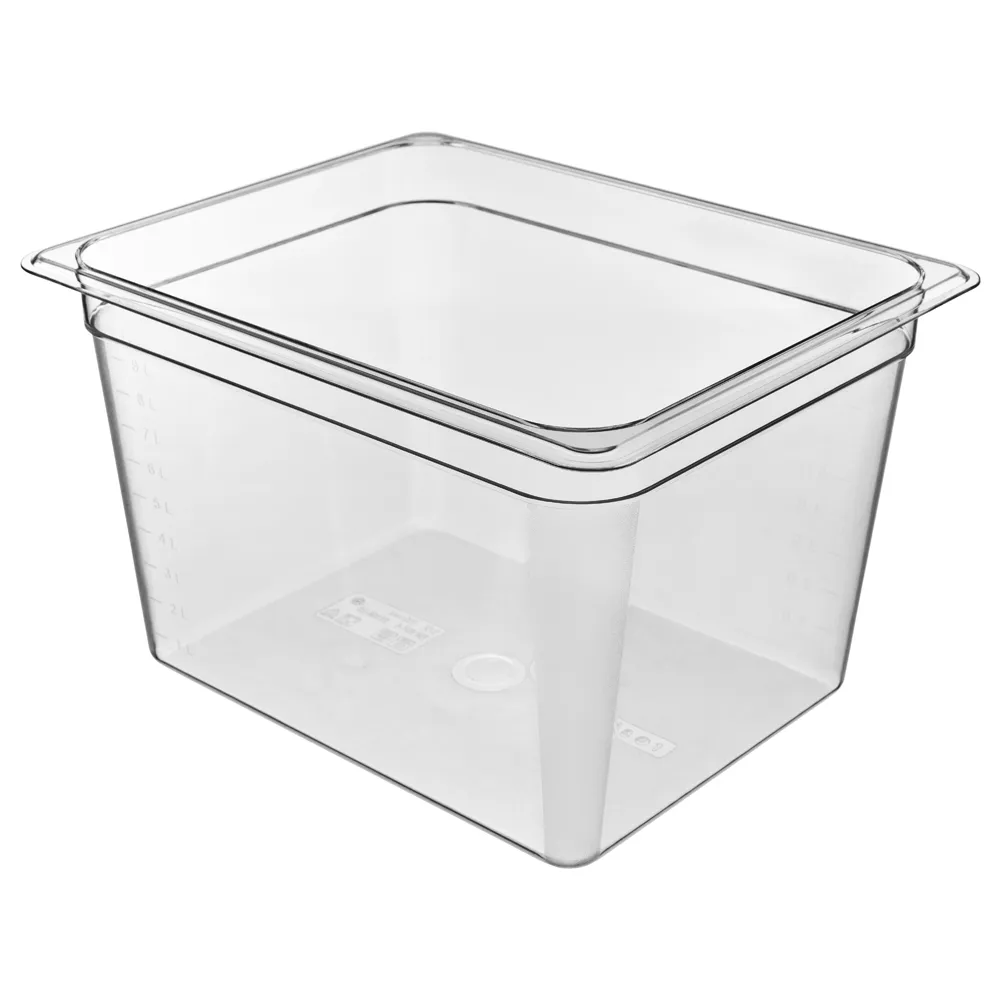 Гастроемкость GN 1/2 глубиной 200 мм, торговая марка RESTOLA. Изделие может использоваться на предприятиях общественного питания для хранения, замораживания и разогревания пищи, а также в кейтеринговых компаниях для транспортировки готовой еды. Предназначена для использования в температурном диапазоне от -40°С до +100°С. Гастроемкости можно мыть в посудомоечной машине при температуре до +95°С, используя любое моющее средство. Изготовлена из поликарбоната, цвет прозрачный, углы и дно корпуса имеют шершавую структуру, что повышает износостойкость при эксплуатации. Есть мерная шкала. Размеры производимых гастроемкостей являются унифицированными в соответствии со стандартом Gastronorm и позволяют использовать их совместно с современным кухонным оборудованием и инвентарем.