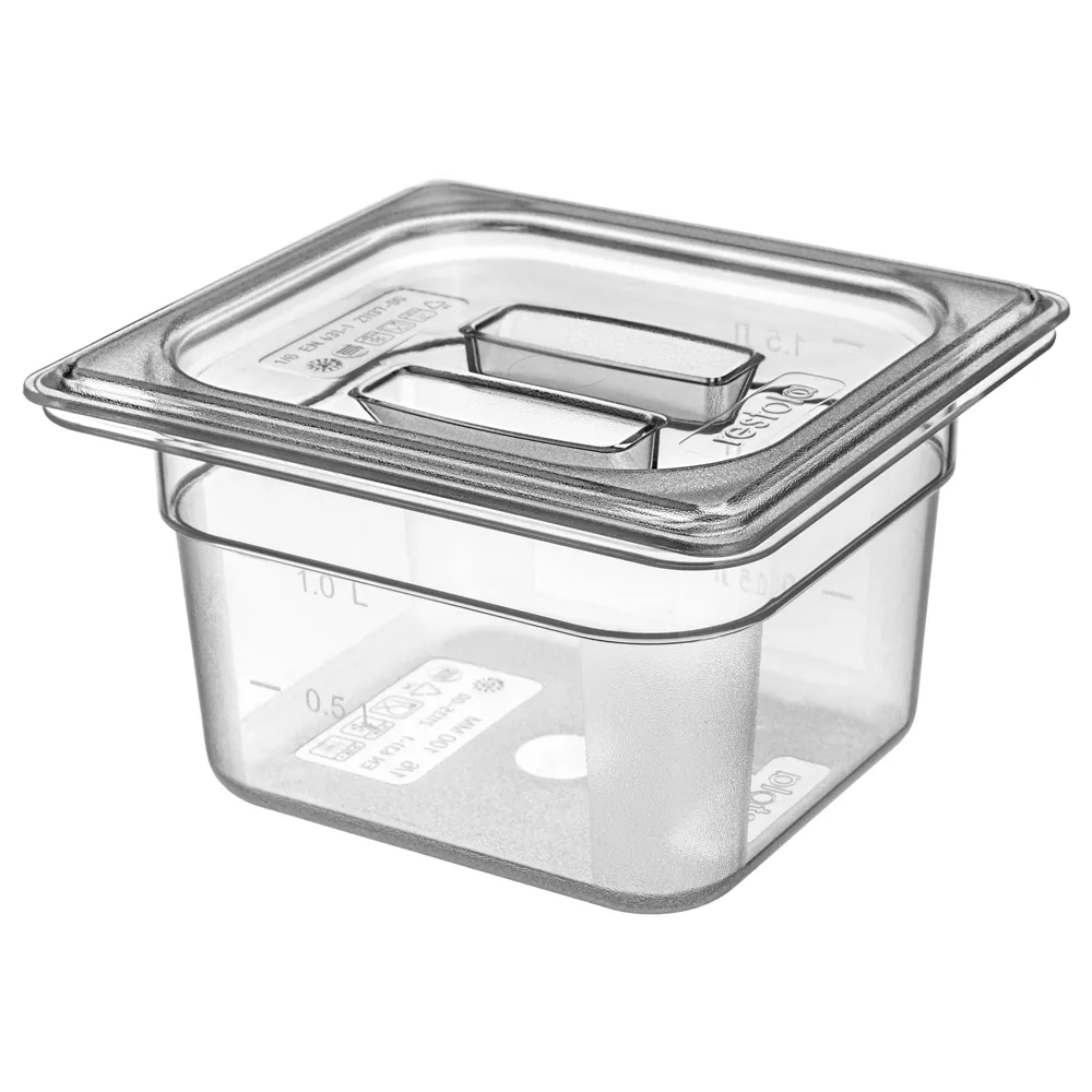 Гастроемкость GN 1/6 глубиной 100 мм, торговая марка RESTOLA. Изделие может использоваться на предприятиях общественного питания для хранения, замораживания и разогревания пищи, а также в кейтеринговых компаниях для транспортировки готовой еды. Предназначена для использования в температурном диапазоне от -40°С до +100°С. Гастроемкости можно мыть в посудомоечной машине при температуре до +95°С, используя любое моющее средство. Изготовлена из поликарбоната, цвет прозрачный, углы и дно корпуса имеют шершавую структуру, что повышает износостойкость при эксплуатации. Есть мерная шкала. Размеры производимых гастроемкостей являются унифицированными в соответствии со стандартом Gastronorm и позволяют использовать их совместно с современным кухонным оборудованием и инвентарем.
