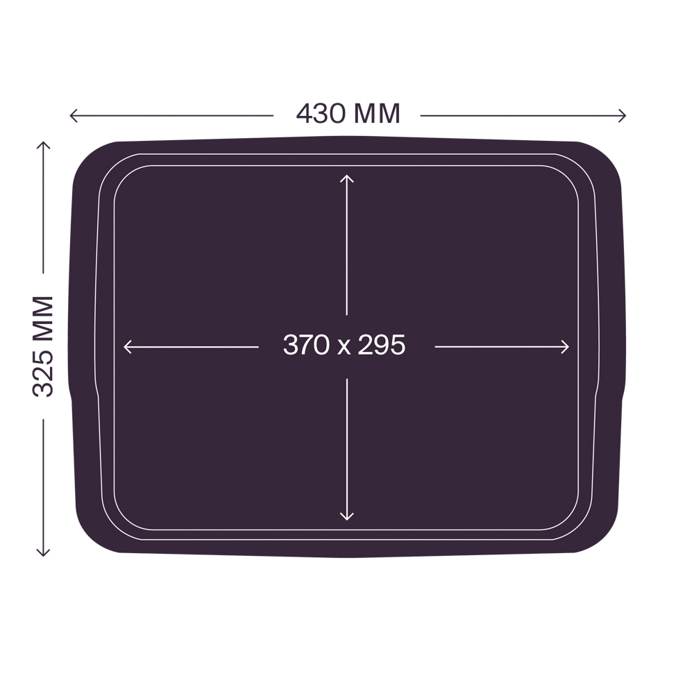 Модель подноса RESTOLA с двухуровневыми ручками имеет внешние габариты 430х325 мм и габариты рабочей поверхности 370х295 мм.