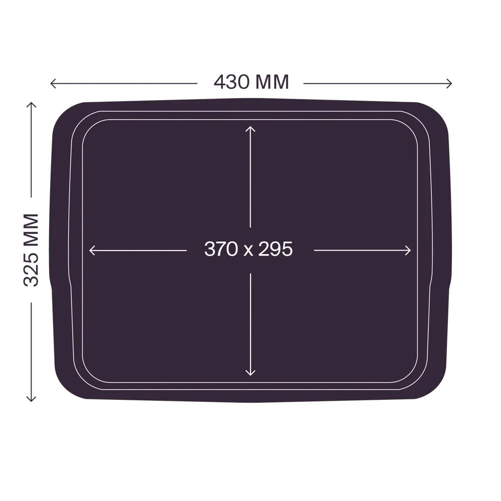 Модель подноса RESTOLA с двухуровневыми ручками имеет внешние габариты 430х325 мм и габариты рабочей поверхности 370х295 мм.