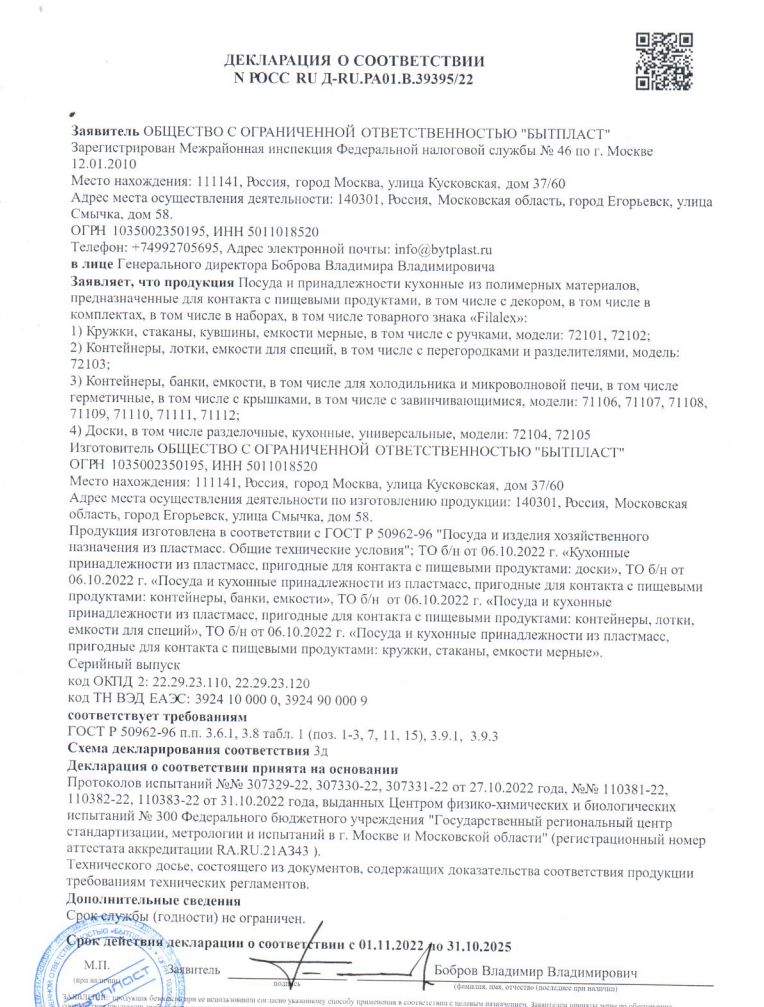 Посуда и принадлежности кухонные из полимерных материалов, предназначенные для контакта с пищевыми продуктами, в том числе с декором, в том числе в комплектах, в том числе в наборах, в том числе товарного знака «Filalex»